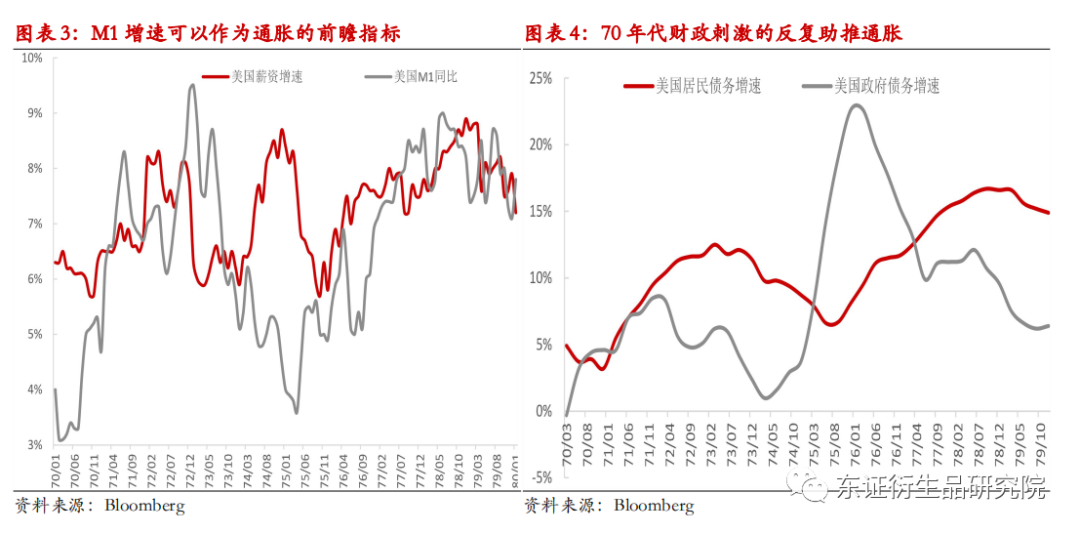 在福特接替卡特担任总统后,最核心的任务就是提振经济,因为此前滞胀阶段失业率上明显,因此很快政策的重点就变为了维持就业,卡特上台后进行了减税计划刺激经济,而美联储则对于上调利率的节奏犹豫不决,因此76年开始的加息很明显不足以对于M1增速产生负面影响。而1978年美联储主席由伯恩斯换成了米勒,米勒的政策和福特的政策倾向高度一致,因此美联储在通胀预期上升的阶段,加息的幅度不足,目的是稳定经济增长。因此这时美联储的政策实际上形成了一个非常不利的预期导向,就是市场的通胀预期上升明显,在经历了74-75年的滞胀之后,通胀预期并未完全被解决,此时的政策造成的结果就是通胀预期的大幅强化,高企的M1增速和薪资增速形成了螺旋循环,叠加79年开始的第二次石油战争,美国通胀演变成了明显的大滞胀。