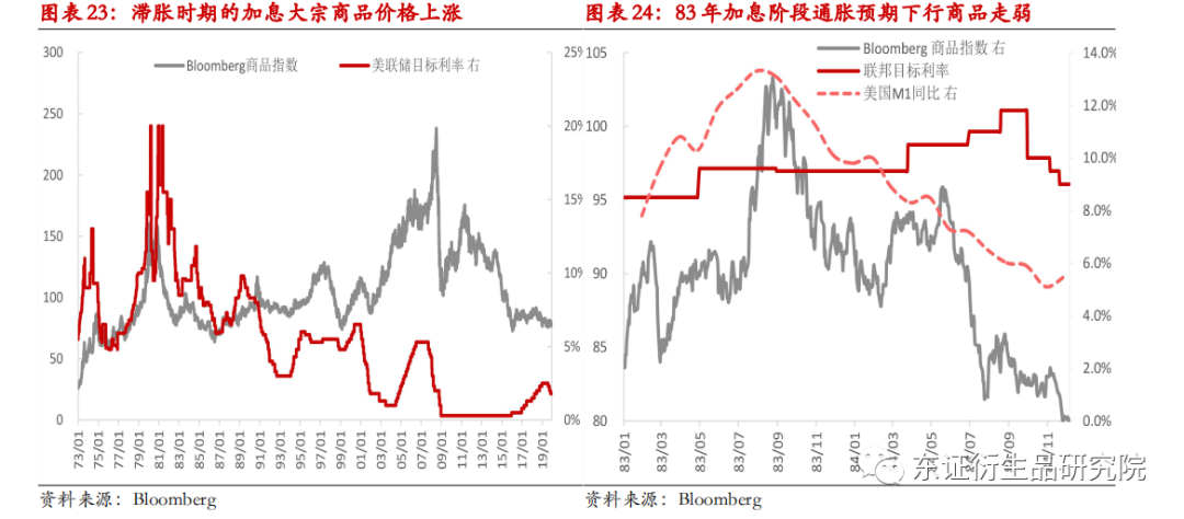 这里特别需要指出83-84年阶段加息和90-00阶段加息实际上是有一些共通之处,在经历了里根的供给侧改革后,83年开始的美国经济出现了较为强势的增长,虽然失业率还在高位,但是市场对于经济增长预期上升,因此83年-84年的加息是强势美元下的加息,美元明显上升,经济走强,大宗商品走弱。94年-00年的加息也是强势美元下的经济增长加息,但是大宗商品在99年开始明显回升,这其中的差别在何处?我们注意到83年的加息阶段之后,美国以当时衡量的通胀预期指标M1增速持续性走低,而99年加息后,美国CPI明显见底回升并且持续上升,这表明通胀预期是大宗价格在强势美元和美国经济高增长状况下能否上涨的主要原因。这也可以解释为何15年之后的加息大宗表现平淡,因为15年之后美国的通胀持续处于低位,通胀预期稳定,因此大宗商品价格表现有限。