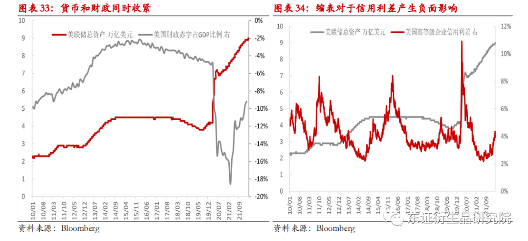 尤其是目前美联储还要缩减自己的资产负债表,美联储上一次缩表的速度和节奏完全无法和本次缩表相提并论,这次缩表是每年1万亿美元甚至更高的速度,这对于信用利差的影响可能比上次缩表还要强。