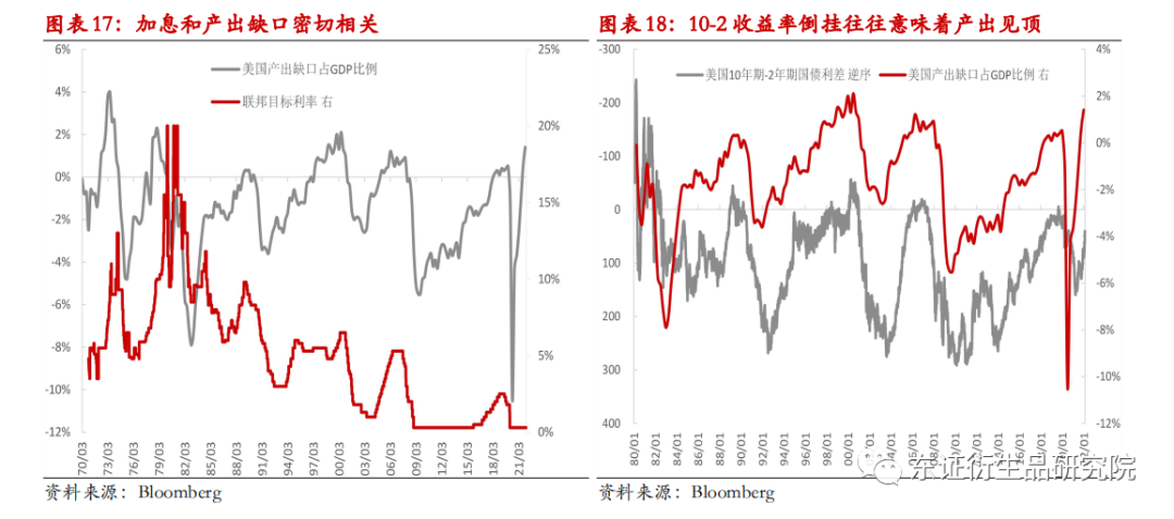 接着说产出缺口的问题,我们可以看到,每一次美联储加息加到顶点,往往就是产出缺口的顶部,因此加息顶点意味着经济潜在产出将出现走低,这也就是为什么我们看到美债10年期和2年期的利差可以预测政策变化,因为10年期和2年期的利差基本上和产出缺口的变化一致,当10年期和两年期利差倒挂往往就是产出缺口到达顶点,也往往就是美联储政策转折的附近。当未来增长潜力开始消退,短期利率上升乏力阶段,正好对应产出缺口高点,因此我们需要密切关注10年期和2年期国债的利差,因为产出缺口数据本身滞后而且频率较低,只能作为滞后指标来确认趋势。