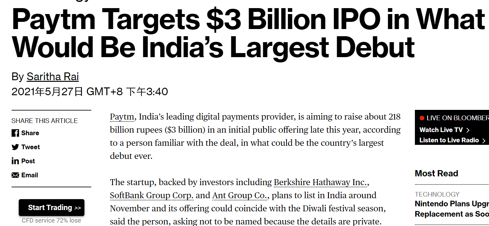 5月27日,彭博报道,据知情人士透露,印度支付巨头Paytm据悉拟进行30亿美元IPO,有望成为印度有史以来最大的IPO交易。
