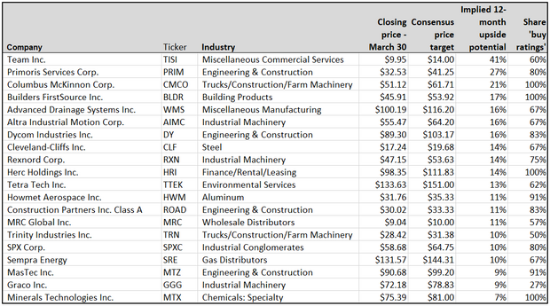 Starting with the 100 stocks held by PAVE, there are 75 covered by at least five analysts polled by FactSet. Among those 75, here are the 20 with the most upside potential over the next 12 months implied by consensus price targets: