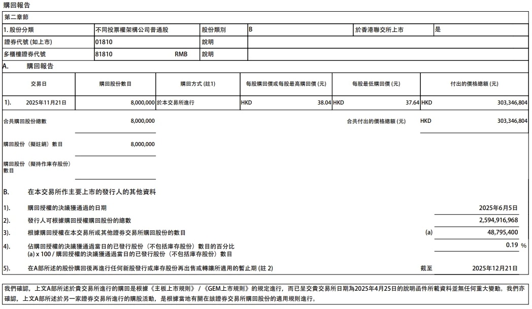 小米集团-W :11月21日斥资约3.03亿港元回购800万股B类股份,每股回购价格为37.64港元-38.04港元。