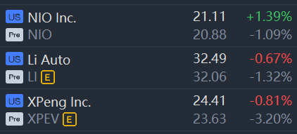 Chinese EV stocks dropped in premarket trading. Xpeng fell more than 3%, Nio and Li Auto fell more than 1%.