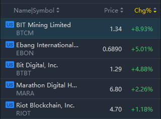 Crypto stocks turned up in morning trading, with BTCM rising nearly 9% and Bit Digital rising nearly 5%.