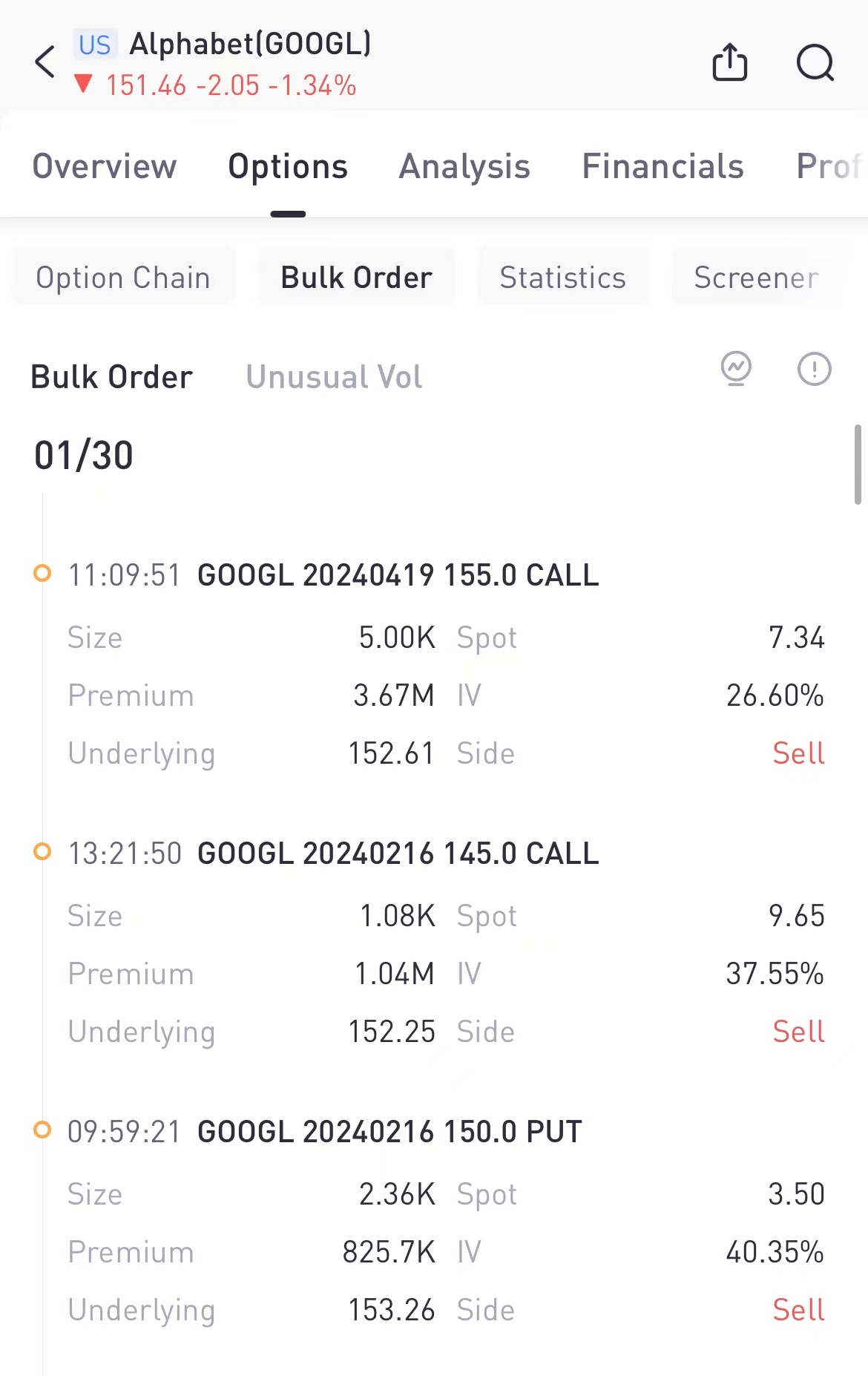A total number of 438.9K options related to Google was traded on Tuesday, 2.17 times higher than the 90-day average volume. Among bulk orders, selling the $155 strike call options expiring April 19th is worth attention as this is a good example for providing protections for stock holders. The gain from selling calls could generate some gains that offset the downside of the stock.