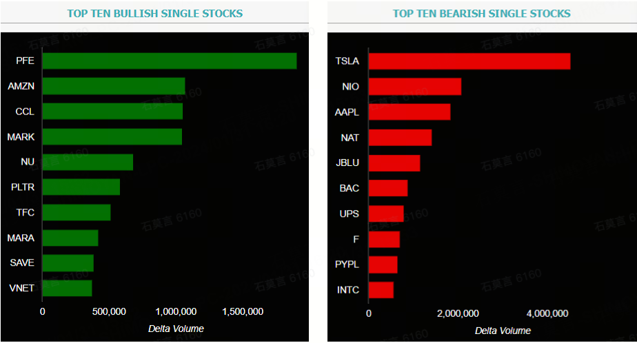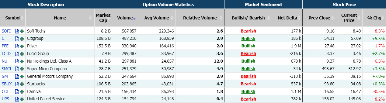 This report shows stocks with the highest volume of bullish and bearish activity by option delta volume, which converts option volume to an equivalent stock volume (bought or sold).