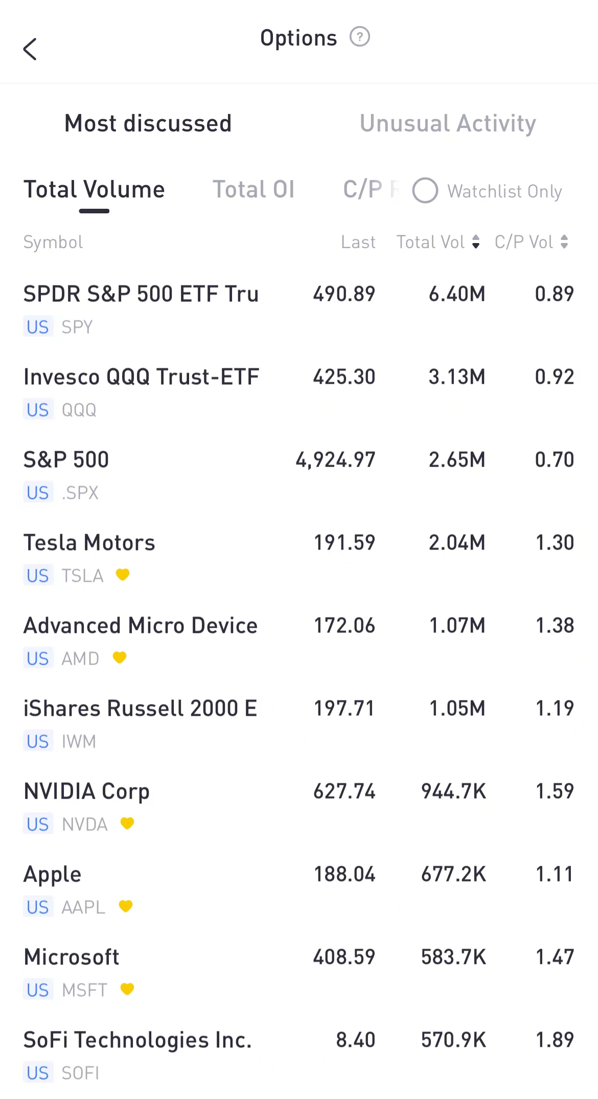 Top 10: SPY; QQQ; SPX; TSLA; AMD; IWM; NVDA; AAPL; MSFT; SOFI