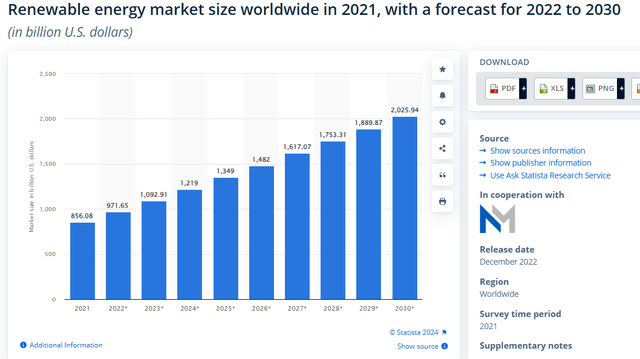 The industry might be volatile due to its relatively young age over the short term, but secular trends are apparently favorable in this domain as well. The renewable energy market's value is expected to almost double between 2024 and 2030, which is another strong tailwind for TSLA.