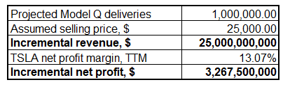 This model can become a huge contributor to the company's profits should they ramp it up as promptly as Model Y. If we assume that TSLA will achieve a million Model Q deliveries within the next couple of years, it will add approximately $3.3 billion of incremental net income. Tesla's TTM net income is $12.7 billion, meaning that Model Q has the potential to boost the bottom line by more than 20% over the next few years. My calculations are outlined in the above table.