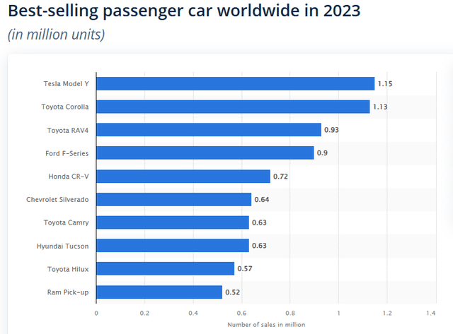 As Statista's above chart suggests, Tesla Model Y was the best-selling passenger car worldwide in 2023. This is absolutely fantastic because the model's production was launched only in 2020. Therefore, I have a firm conviction that due to targeting a large market of price-conscious customers, Model Q also has solid potential to become one of the best-selling vehicles worldwide over just a few years.