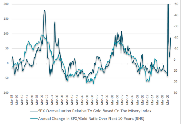 下图显示了标准普尔500指数/黄金比率相对于苦难指数的高估程度,与随后的10年年度回报比率。