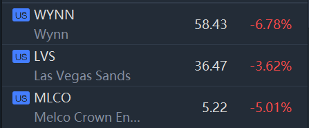 Casino stocks slumped in morning trading. Wynn, Las Vegas Sands and Melco Crown fell between 3% and 6%.