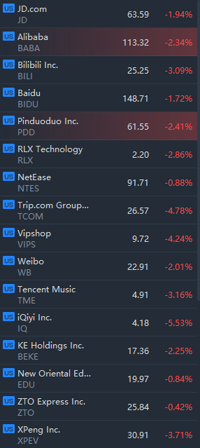 Hot Chinese ADRs slipped in morning trading. Alibaba, JD.com, Pinduoduo, Baidu, iQiyi, Nio, Xpeng, Bilibili and KE Holding fell between 1% and 5%.
