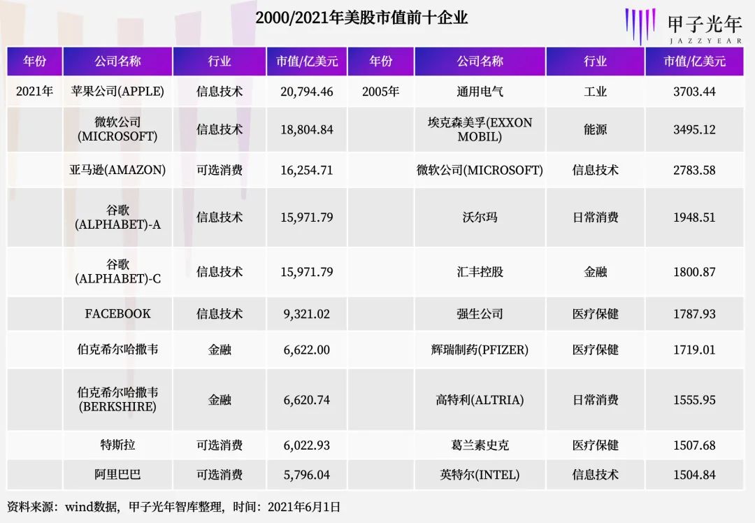 2005年美股市值前十的企业中信息技术企业只有2家,2020年已达5家;2012年苹果成为美股第一大市值公司。