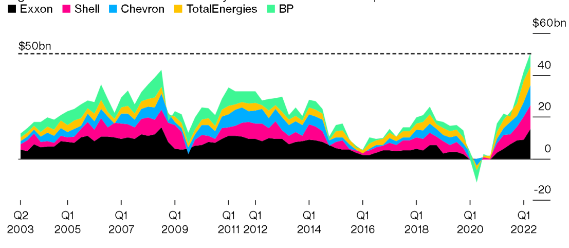 俄乌冲突期间,不仅原油价格飙升,天然气价格和炼油利润率也打破历史纪录。埃克森美孚(Exxon Mobil Corp.)、雪佛龙(Chevron Corp.)、壳牌(Shell Plc)、欧洲道达尔能源(Total Energies)和英国石油公司(BP Plc)——这些被统称为超级石油巨头的公司今年二季度的利润预计将超过2008年,当时国际油价飙升至每桶147美元。