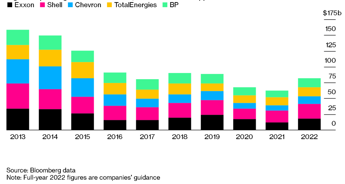 不过,大型石油公司可能无法长期保持如此低的资本支出,因为它们也需要在通胀成本环境中增加支出。世界最大的油田服务公司斯伦贝谢(Schlumberger NV)上周表示,其销售额同比增长了近20%,并认为对其服务的需求将出现“多年的增长周期”。
