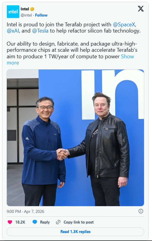 Intel posted on X that it was “proud to join the Terafab project,” which includes SpaceX, xAI, and Tesla. It added, “Our ability to design, fabricate, and package ultra-high-performance chips at scale will help accelerate Terafab’s aim” to produce 1 terawatt a year of computing power for future advances in AI and robotics.