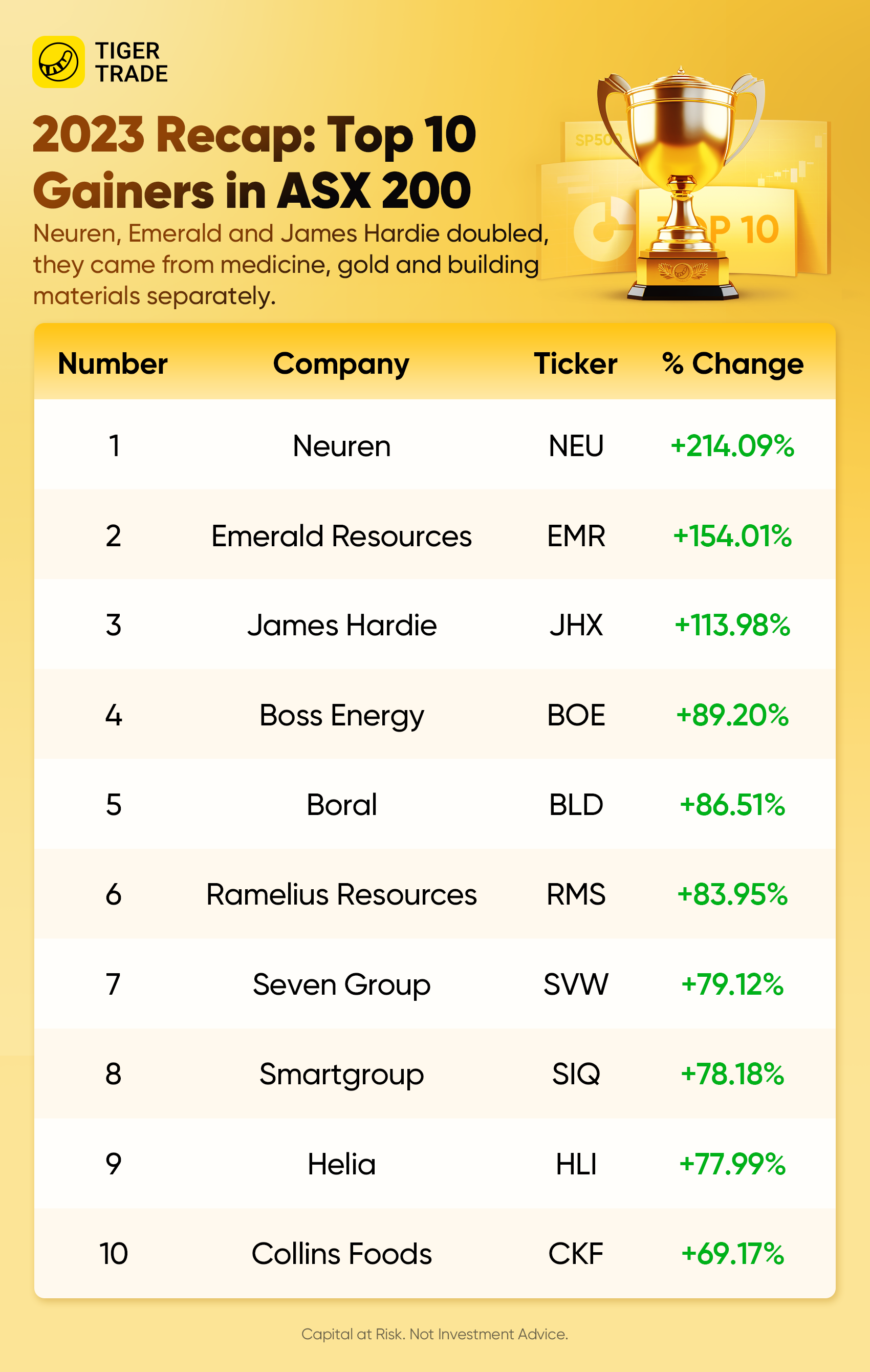 The S&P/ASX 200 ended the year at 7590.8 and rose 7.83% in 2023, its best return since 2021. Neuren Pharma, Emerald Resources NL and JAMES HARDIE INDUSTRIES-CDI doubled in 2023, and they came from medicine, gold and building materials separately.
