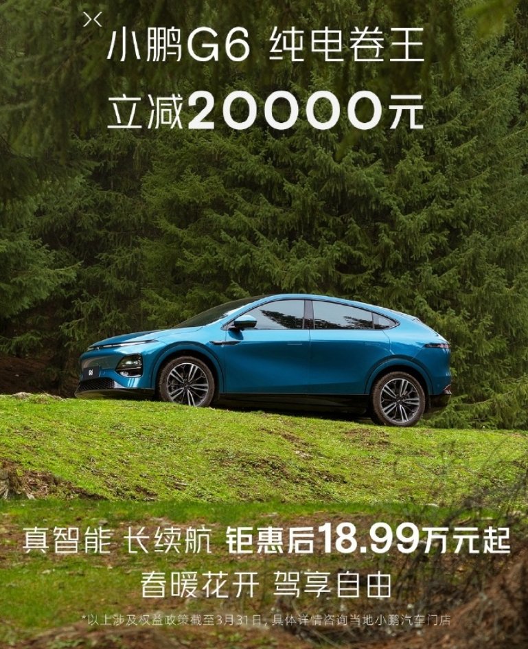 3月3日,小鹏汽车宣布,2024年3月31日前,小鹏G6全系车型限时立减20000元,优惠后售价为18.99万元起。