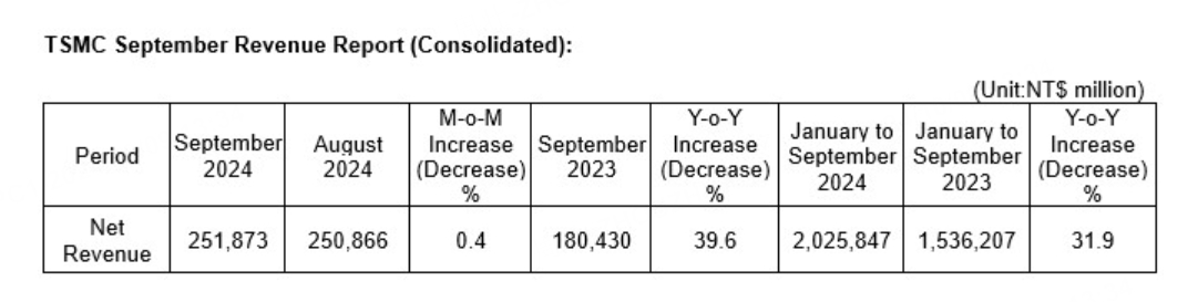 10月9日,台积电公布了9月的净营收,9月销售额2518.7亿元台币,同比增长39.6%,环比增长0.4%;今年迄今,台积电销售额总计新台币20258.5亿元台币,较去年同期增长31.9%。