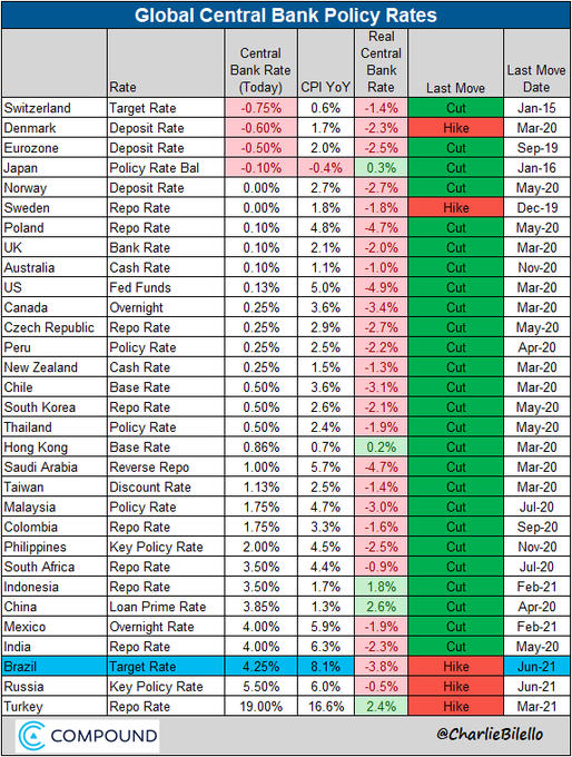 巴西央行年内迄今的加息幅度已经超过了包括土耳其和俄罗斯在内的其他新兴市场央行。