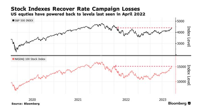 目前来看,尽管在六月议息会议后美联储主席鲍威尔依然坚持放鹰,但货币政策的未来路径已有很高确定性,市场普遍预计加息已经临近终点,联储的紧缩立场已经无法再抑制市场的上行动力。