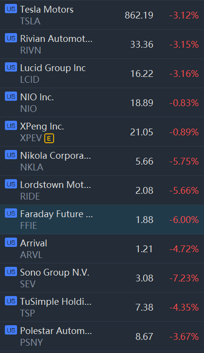 EV Stocks slid in morning trading. Tesla, Lucid, Rivian, Nio, Xpeng, Nikola, Faraday Future, Tusimple, Arrival, Sono and Fisker fell between 0.8% and 7%.
