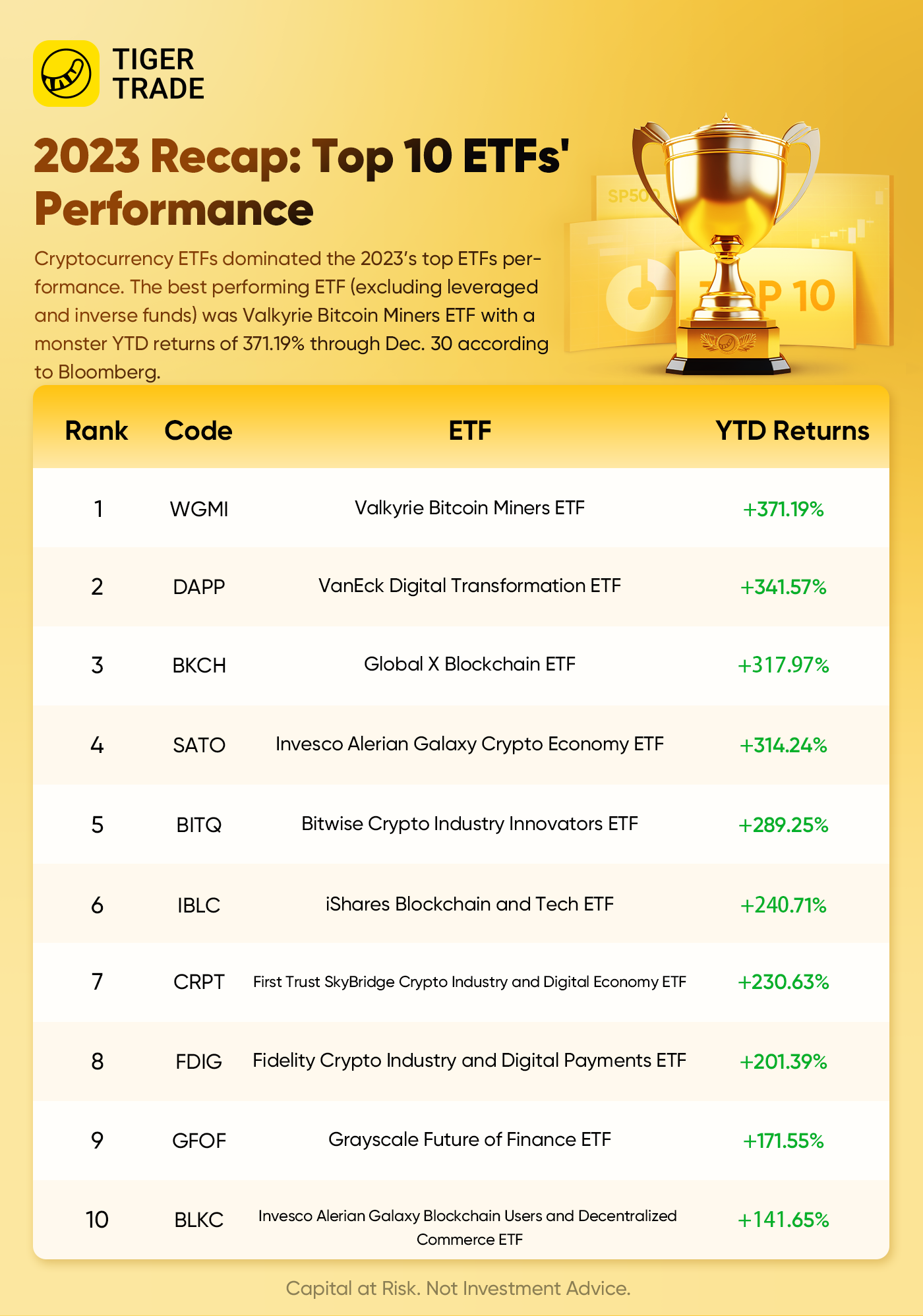 Cryptocurrency ETFs dominated the 2023’s top ETFs performance. The best performing ETF (excluding leveraged and inverse funds) was Valkyrie Bitcoin Miners ETF with a monster YTD returns of 371.19% through Dec. 30 according to Bloomberg.