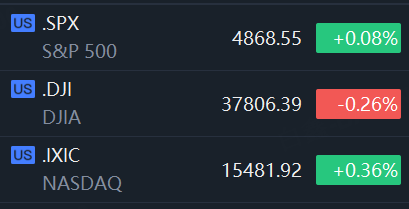 The S&P 500 climbed 0.08% to end the session at 4,868.55 points. The Nasdaq gained 0.36% to 15,481.92 points, while Dow Jones Industrial Average declined 0.26% to 37,806.39 points.