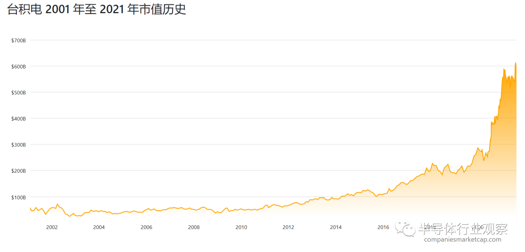 在过去的20年里,台积电深耕技术,稳扎稳打,在不断赢得客户的情况下,市值一直稳步提升。经过多年的积累,在最近5年结出了丰硕的果实,不但工艺技术和市占率领袖群伦,其市值更是在近两年内如火箭般窜升。