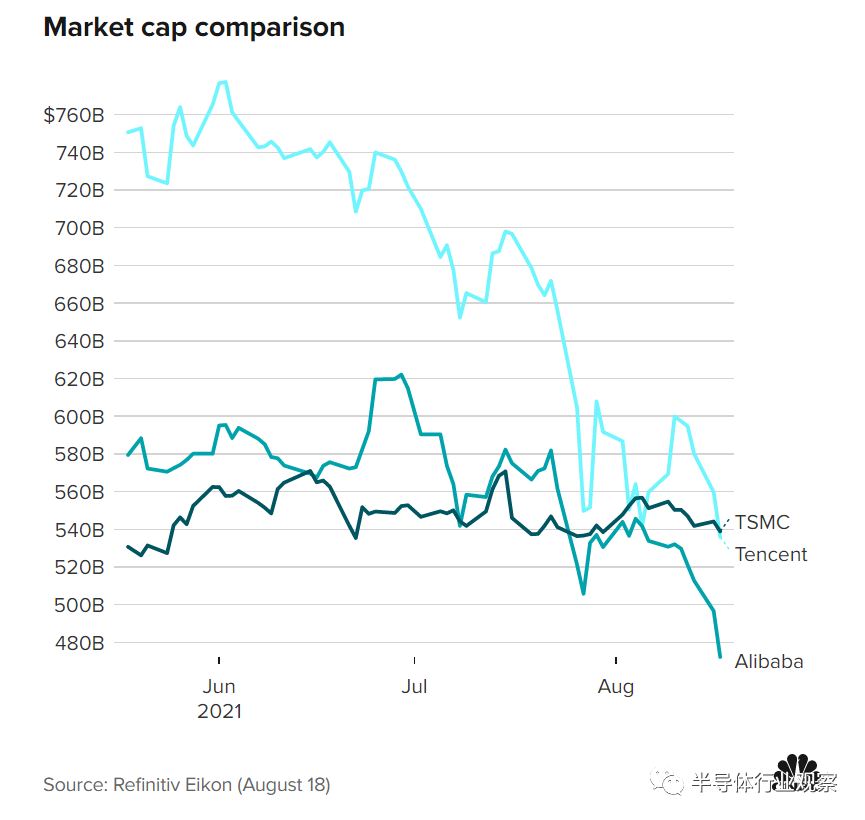 根据 Refinitiv Eikon 截至8月18日上午的数据,台积电在亚洲公司中以超过 5380 亿美元的市值位居榜首。腾讯以超过 5360 亿美元的市值位居第二。