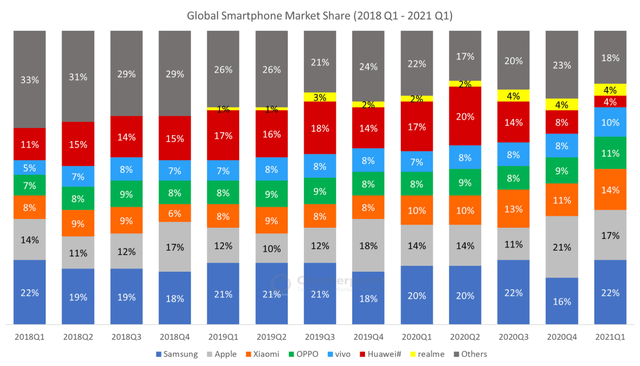 The exposure that MediaTek has obtained from its relationship with Chinese smartphone manufacturers, Xiaomi and Oppo, has been highly beneficial as these companies are cannibalizing Huawei’s sales which have felt the impact of the trade embargo by the US. As shown in the chart below, Chinese smartphone competitors have gained market share at the expense of Huawei.