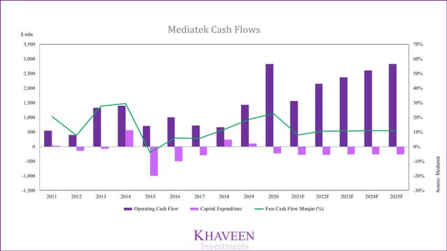 In comparison, MediaTek’s 5-year average free cash flow margin is lower than Qualcomm at 12.95%.