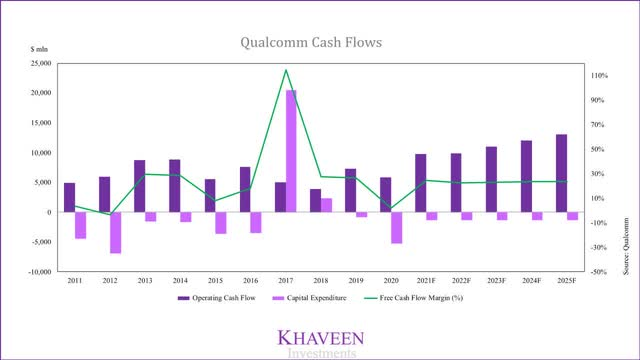 Qualcomm’s 5-year average free cash flow margin is 37.71%. The extremely high positive capex in 2017 is due to the sale of marketable securities for $41,715 mln.
