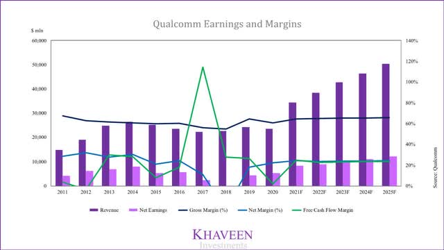 The 5-year average revenue growth of Qualcomm is -1.3%. The 5-year average gross and net margins are 59.3% and 10.68%, respectively.