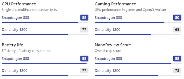 For the premium tier, the Snapdragon 888 is Qualcomm’s latest and most advanced chipset which is compared to MediaTek’s Dimensity 1000 series. The Snapdragon 888 has a Centurion Mark score of 156 which is higher than Dimensity 1000 at up to 150 only. Specification wise, both chips have the same number of ARM Cortex cores but the fundamentaldifferencesbetween these chipsets are the process technology used to manufacture them. Qualcomm uses a 5nm process by Samsung while MediaTek uses 6nm for the Dimensity chip leading to better CPU performance and battery life from more efficient power consumption. Additionally, Qualcomm’s Adreno GPUs are semi-customed by Qualcomm while MediaTek uses a standard ARM Mali GPU which also explains the better GPU performance for Qualcomm.