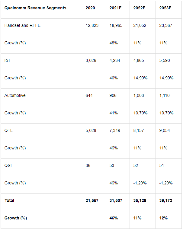 The revenue projections for Qualcomm in 2021 are based on the prorated figure. We used the revenues obtained in the first 2 quarters, along with the third quarterguidance, to forecast the full year revenue. For 2022 and 2023, the forecasted revenues are based on the market CAGR for each of the segments. The handset and RFFE segment is expected togrowat 11% which is the market forecast for the global smartphone application processor market. The QTL segment is also based on the same growth rate as the segments are interlinked. The IoT segment is expected togrowat 14.9% which is the market forecast for the global IoT chip market. Similarly, the automotive segment is expected togrowat 10.7% which is the global automotive chip market CAGR. Overall, the revenue growth for 2021 is forecasted at 46%. For 2022 and 2023, the revenue growth forecast is 11% and 12%, respectively.