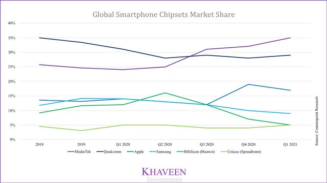 In the smartphone market, both Qualcomm Incorporated(NASDAQ:QCOM)and MediaTek Inc.(OTCPK:MDTKF)are prominent suppliers of application processors which is a chipset essential to power a smartphone device. In terms of market share, both companies are dominant players, accounting for over 50% of the smartphone application processor market combined. Qualcomm has its renowned Snapdragon series of chipsets while MediaTek has the featured Helios and expanded Dimensity lineup. However, MediaTek has been more successful with its lineup, securing design wins with major smartphone manufacturers leading to it gaining share at the expense of Qualcomm.