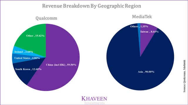 Comparing both companies’ revenue breakdown by region, both Qualcomm and MediaTek derive a significant portion of their revenues from the Asia Pacific region with Qualcomm making 59% of revenue from China.
