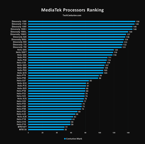 To compare the performance of the companies’ chipsets, we referred to benchmarks from Centurion Mark, which is a well-regarded benchmark used to analyze the performance of each series of application processors. Centurion Mark is determined by testing the processors on over 20 different parameters. Some of these parameters such as User Experience and Raw CPU Performance have a significant impact on the score while there are some minor parameters as well that make a little difference (For example, Dual VoLTE Support). These are the 5 major factors that influence Centurion Mark: User Experience, Real-World Performance, Raw CPU Performance, Raw GPU Performance, Features and Technologies Present. The graphs below show the centurion mark for both Qualcomm and MediaTek chips. Based on the centurion mark, Qualcomm appears to have better performing chipsets with a higher score.