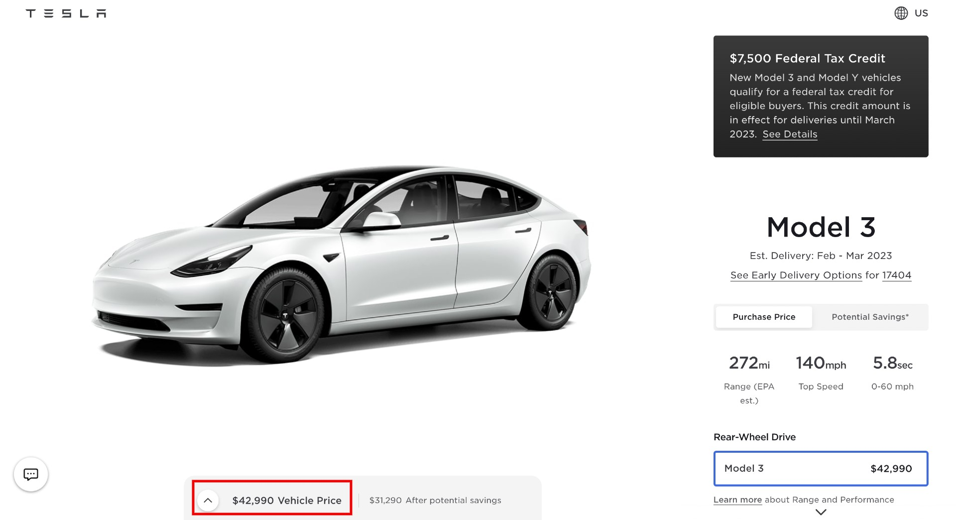 Tesla cut Model 3 Rear-Wheel-Drive prices by $500, bringing the vehicle down to $42,990 from $43,490. This trim, in particular, offers 272 miles of range and a 140 MPH top speed.