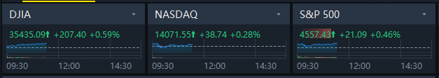 U.S. stocks remained green in morning trading; Dow Jones jumped 0.59%, S&P 500 gained 0.46% while Nasdaq rose 0.28%.
