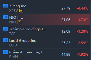 EV stocks slid in morning trading, with Xpeng and Nio falling about 4%.