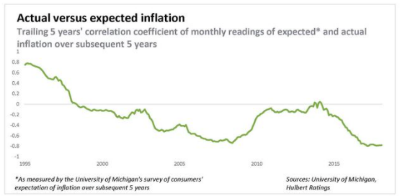 然而,财经记者Mark Hulbert却认为,这一理论却并没有得到足够的历史证据支撑。他表示,过去几十年中,消费者的通胀预期反而往往是一个反向指标,当通胀预期高于平均通胀水平时,随后五年的通胀却低于平均水平,反之亦然。