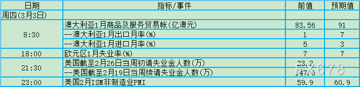 经济数据方面:一系列重磅数据出炉:中国将有官方PMI数据发布;美国非农就业数据、美国2月失业率、美国2月ADP就业人数等;