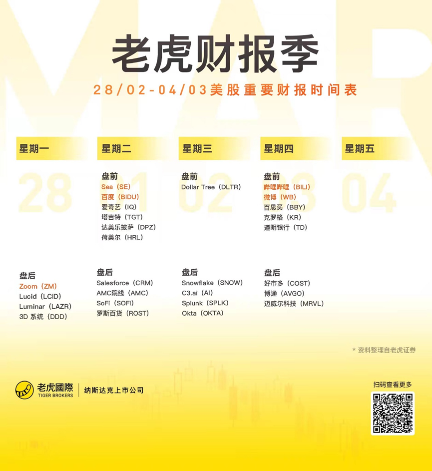 财报方面:Zoom、Lucid、Sea、百度、哔哩哔哩、爱奇艺、微博等最新业绩即将公布;