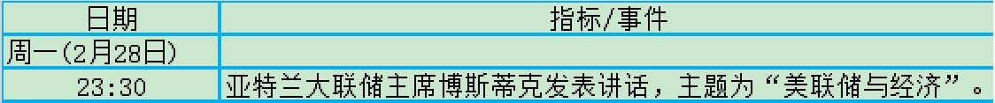 事件方面:2022年全国两会召开在即;美联储主席鲍威尔将发表半年度货币政策证词;亚特兰大联储主席博斯蒂克及FOMC常任票委威廉姆斯将发表讲话。