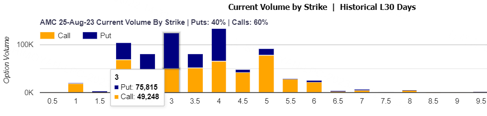 A total number of 1,238,469 options related to AMC was traded. A particularly high trading volume was seen for the $3 strike put options expiring August 25, with a total number of 75,815 option contracts trading on Monday.