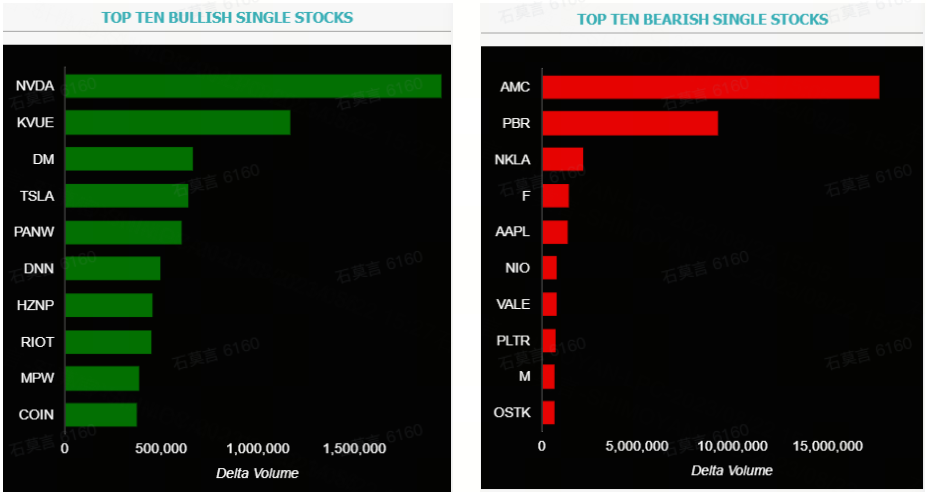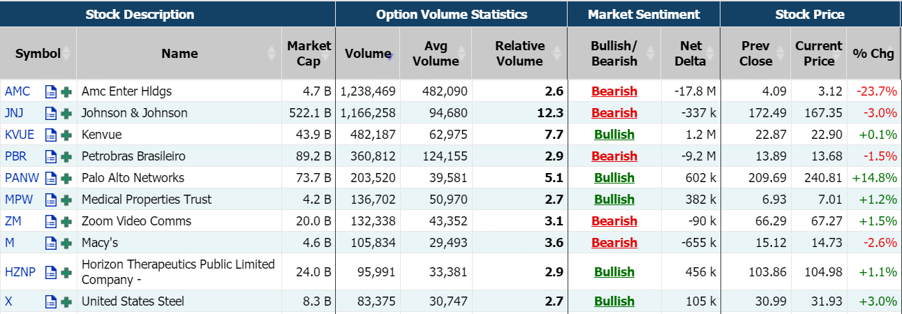This report shows stocks with the highest volume of bullish and bearish activity by option delta volume, which converts option volume to an equivalent stock volume (bought or sold).